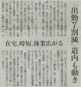 【メディア掲載情報】2020年4月14日発行北海道新聞【メディア掲載情報】 メディア:北海道新聞 2020年4月14日朝刊 内容:新型コロナウイルス感染拡大防止、「緊急共同宣言」は発令に伴う企業対策 < 次の記事前の記事 > 戻る
