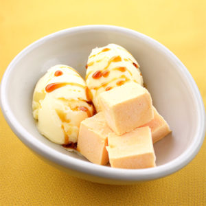 ◆北海道夕張メロンのキューブアイス ~黒蜜のバニラアイス添え~ 380円(税込)