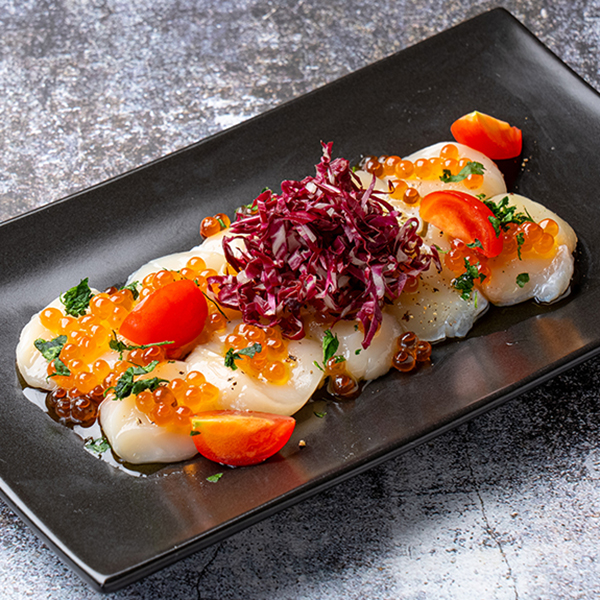 プリプリで大粒の北海道常呂産ホタテに白ワインに合わせたい、贅沢な海の恵みを楽しむカルパッチョ
